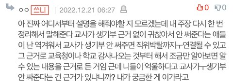 세특 귀찮아서 대충 써주는 교사들 많다 ㅈ반고에 그런 교사들 많아서 애들이 생기부 잘 써지기 힘들다vs 대학잘보내면 교사한테 이익있고 교육청 감사땜에 직위박탈 당해서 쌤은 죄다 열심히 써주려한다 생기부 망한건 전적으로 학생 문제다로 개싸움 글쓰니 혼자 후자 입장이었고 지 언니랑 아빠 교사라고 주워들은 얘기로 고집부리면서 개싸움