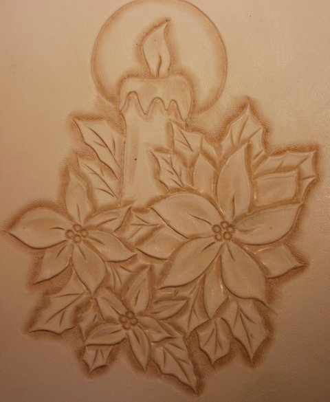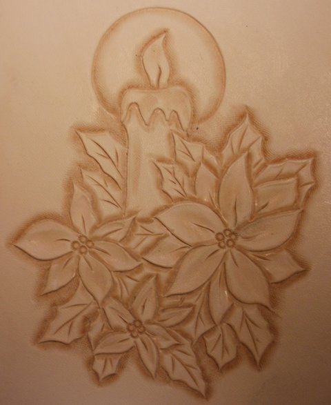 가죽에 크리스마스 상징 호랑가시나무와 촛불 디자인을 카빙하였습니다.