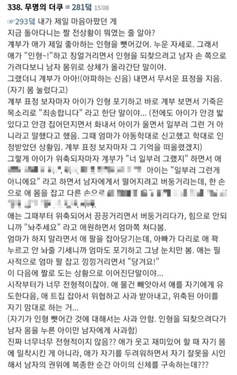 방송 신청은 계부가 한겁니다. 본인의 행태에 대한 자각이 1도 없어요. 어쩐지 방송 나와서 자신있게 평소 모습을 보여주더라구요. "애가 싫다고는 하는데 진짜 싫은건지 모르겠다" 롸..???? 어떤, 강간해 놓고 "왜 너도 좋았잖아?" 라고 하는 사람이 저런 식으로 생성 되나봐요. 전자발찌 인터뷰이 같지 않습니까? 본인은 잘못이 없어요. 나 억울하고 외로워~ 빼박 범죄자 마인드입니다. 니 외로운 걸 7살 애한테 어쩌라고???!!!!!!!! 친모는 뭐 개선해 볼 생각도 없었던 것 같아요. 예전에 신고한 건 성범죄와는 상관 없는 폭력 성향 때문이었구요. 와 남자 다가졌네. 성범죄뿐만 아니라 그 외 학대 까지?!?! 그런 남자 만나려면 여자도 보통 이상은 돼야죠. 갈등을 조금만 걷어내면 셋이 잘 살수 있다나? 뭐 그러더라구요.. 눈 앞에서 애가 싫다고 외치면서 유사성행위 당하는데 눈막 귀막 하하하.. 저거 누가 봐도 유사성행위임. 아니라고 하는 사람은 그럼 유사성행위를 정의해 봐! 행보가 궁금합니다. 방송사는 유사성행위라고 인정 안하지 않을까요? 왜냐면 그러면 지네가 아동 유사성행위 범죄현장을 송출한 게 되잖아요.. 댓글 보니까 몇 달 전에 찍어놓고 방송은 이제 탄 거더라구요. 기간이 대략 6개월이라던데.. 애는 그동안 그 집에 계속 있었던 거잖아요. 처벌이 제대로 이루어질까, 하도 솜방망이 처벌을 많이 봐서 ㅠㅠ 그래도 처벌 되겠죠. 애는 꼭 분리 되겠죠. 너무 가슴 아프고 답답해요.