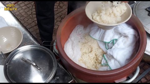 쏘이 찌엔 퐁(Xôi chiên phồng)은 코코넛 워터와 녹두, 설탕을 넣어 찹쌀밥을 지은 후에