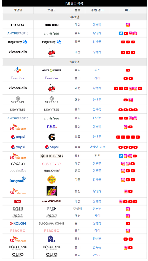 현재 광고 모델 중인 것만 장원영 12개, 안유진 6개, 레이 3개, 이서 1개
