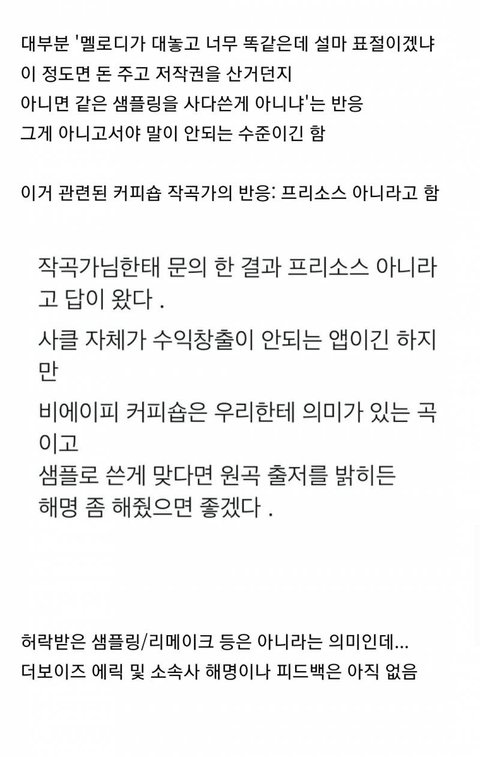 그게 비에이피 커피숍 곡이랑 같아 표절로 된 거