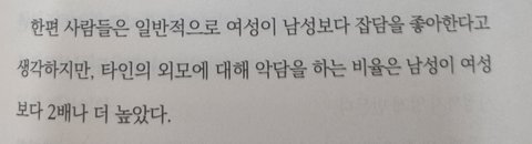 근데 실제로 남자들 얼평 개심하다는 연구결과가 있긴 함ㅋㅋㅋ 여자들이 소문, 가십거리를 좋아하긴 해도 얼평은 남자들이 오진다는 내용임. 남자들 거울 잘 안보는 건 만국공통인듯