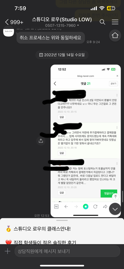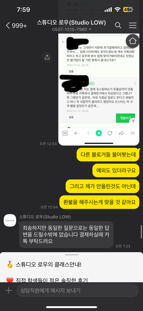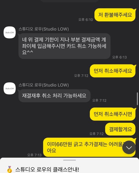 7. 오로지 카톡만 받아서 연락하니 수업하는 선생님이 본인이 대표라고 하면서환불 받고 싶으면 인스타 2일 지연약 9만원돈 결제 시 해주겠다고 추가 결제창 줌