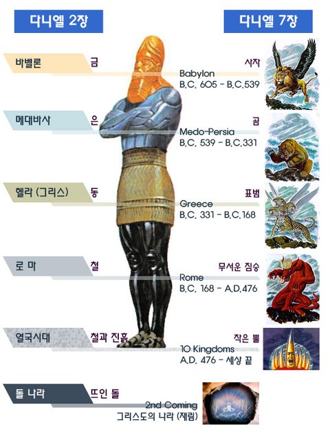 “왕이여 왕이 한 큰 신상을 보셨나이다 그 신상이 왕의 앞에 섰는 데 크고 광채가 특심하며 그 모양이 심히 두려우니 그 우상의 머리는 정금이요 가슴과 팔들은 은이요 배와 넓적다리는 놋이요 그 종아리는 철이요 그 발은 얼마는 철이요 얼마는 진흙이었나이다”