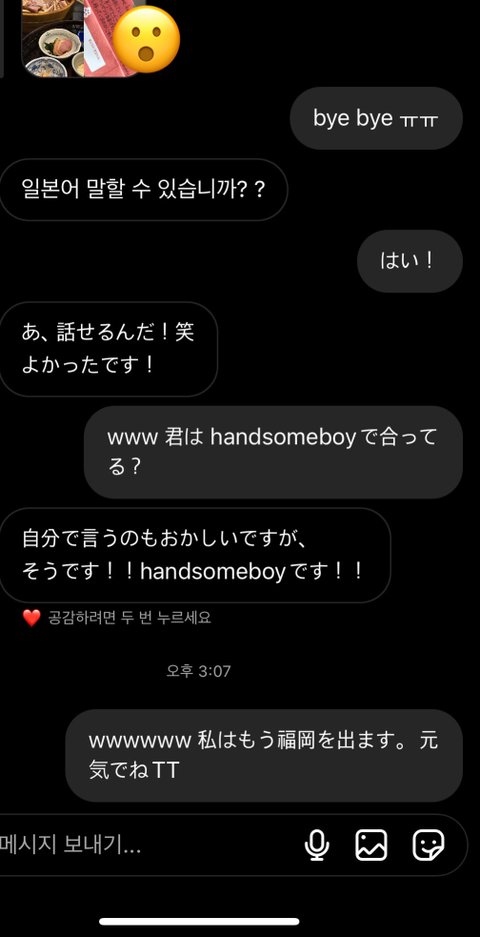 료칸숙소다 보니까 계속 그 직원이랑 마주치고 아침에도 마주치고 어쩌다보니까 계속 마주치고 번역기 대화해서 좀 친밀감이 드는거야 고맙기도 했고 그래서 선물을 주고싶은데 가진게 한국돈 뿐이라 ㅋㅋㅋ그사람은 일본인이니까 이것도 의미있지 않을까? 해서 천원권 봉투에 넣어서 여기 머무는 동안 고마웠다고 선물을 주고싶지만 가진게 이거뿐이다 쓰고 뭔가 이대로 헤어지는게 좀 아쉬워서 내 인스타 아이디 남기고 체크아웃할때 프레젠또 ..^^ 하면서 주고 바이바이 인사하고 떠났는데 인스타 팔로우가 왔더라고 ...ㅋㅋㄱㅋ 알고보니까 나랑 동갑에 태어난 월까지 같아서 신기했음 다시 생각해도 운명같고 신기한 일인거같아
