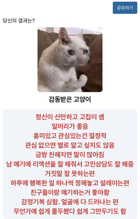 뭔가 맞는 것 같애.. https://testharo.com/animal-memes/results/ko?data=RU5GUA%3D%3D