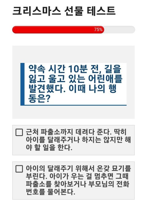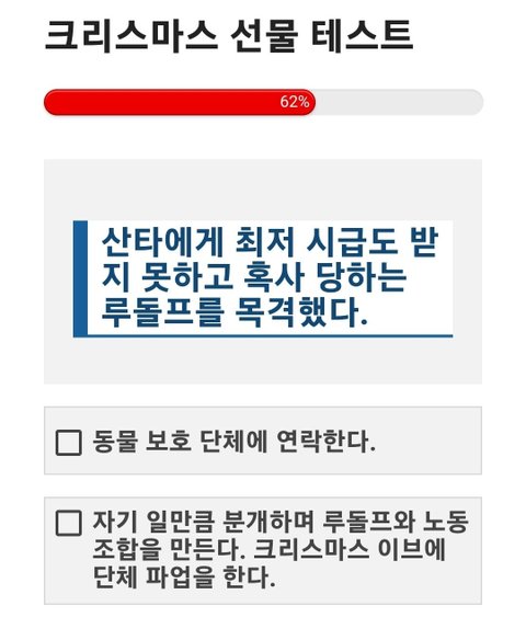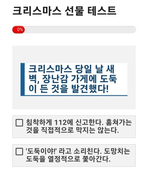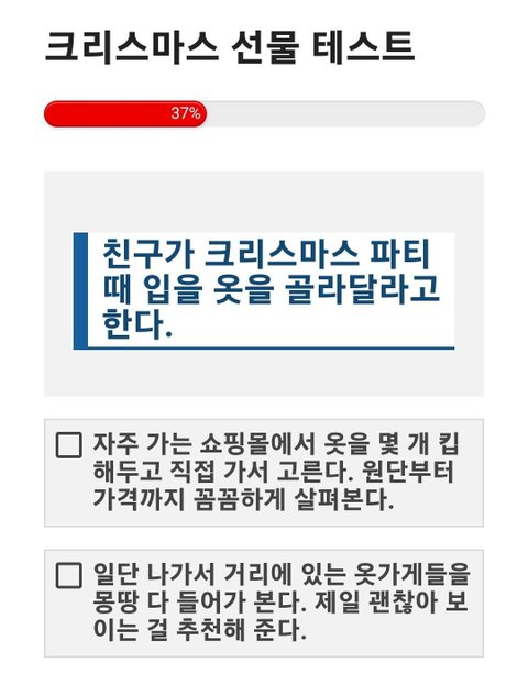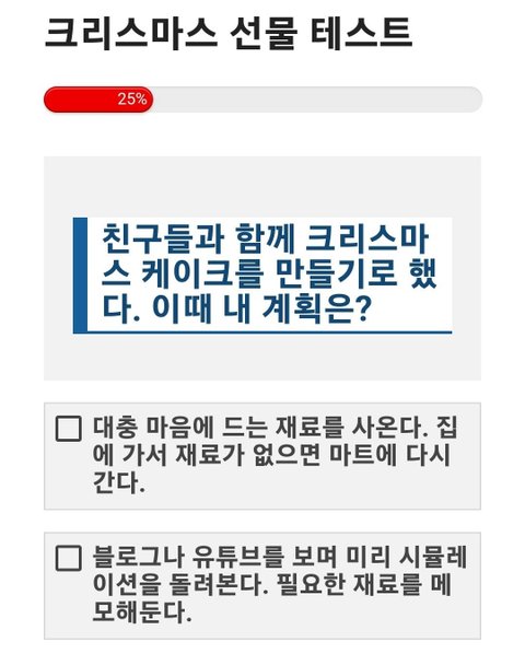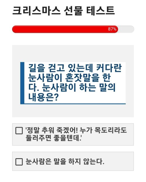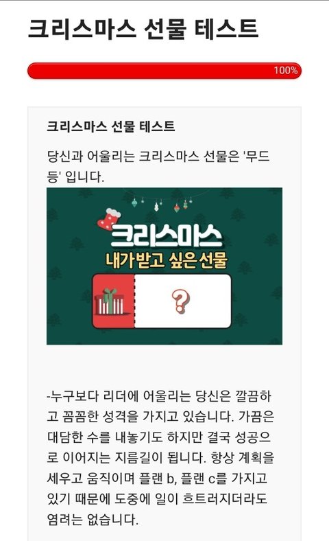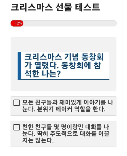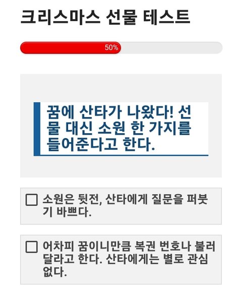 크리스마스 선물 테스트 크리스마스 트리 아래에 잔뜩 쌓인 선물 상자들. 두근거리는 마음으로 상자를 집어 들었다. 내 성격과 어울리는 선물은 무엇일까? https://imkyum.co.kr/7948/