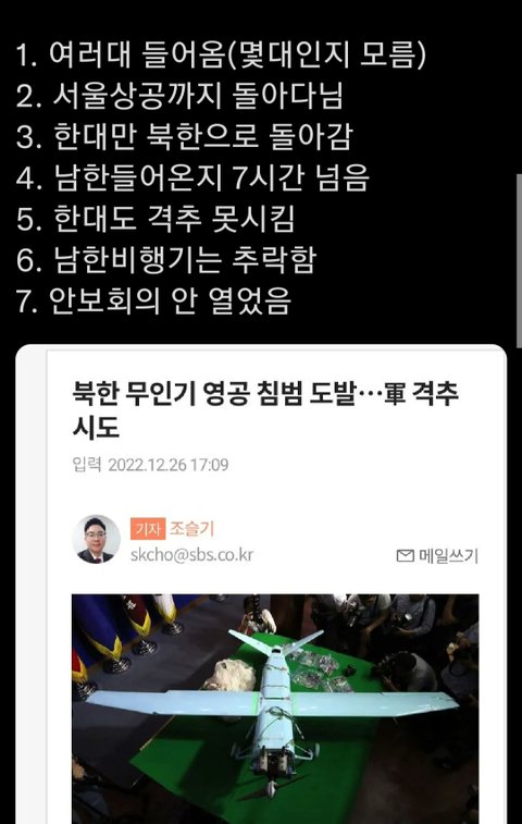 문재인때는 무인기가 저 멀리 상주까지 유유히 날아가서 사드 찍었다는데 쉬쉬했잖아 문재인 당선 2017년 5월, 상주사드기지 무인기 침범한것 발견 2017년 6월9일. 북한 눈치 안보고 투명하게 속보로 공개하는게 좋아보이던데. 격추 못 시킨건 민간에 피해가 갈까봐 위협만 가했다고 하던데? 격추해서 니네 집 지붕위에 떨어지면 또 피해자 모임 만들어서 퇴진&탄핵 노래부를거 아님? 아니 사드찍은 무인기 발견했으면 언론에 대대적으로 투명하게 공개했어야지 왜 쉬쉬했냐고. 쉬쉬한것도 황교안 권한대행이냐?
