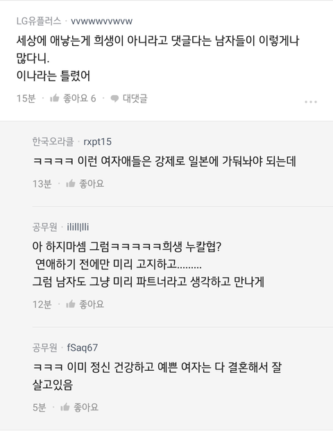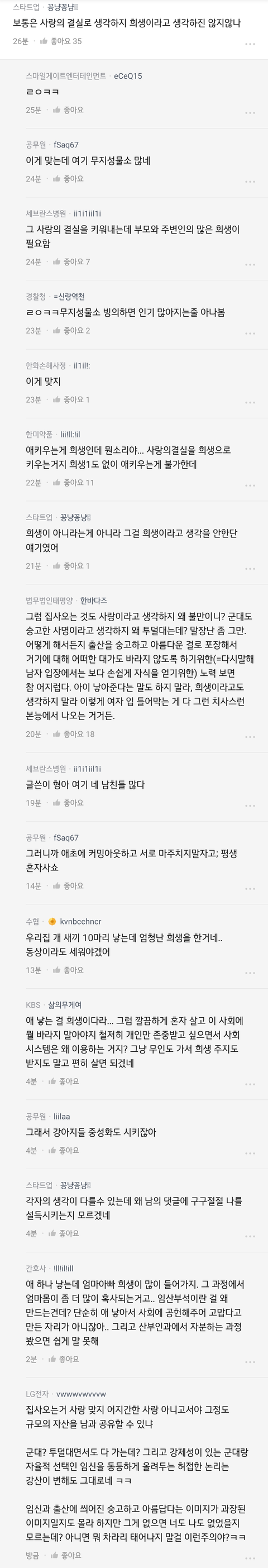 애 낳는게 여자의 희생 맞지. ㅂㅅ인가 사랑의결실 같은 허울좋은소리 하고 자빠졌네 ㅉㅉ 사랑의 결실이란 말은 말이야. 책임감을 가지고 애 육아 적극적으로 함께하고 아이 낳느라 몸의 기능이 떨어지는 와이프를 케어해주고. 아이가 다 클때 까지 올바른 방향으로 책임을 다 하는, 지가 싼거 지가 책임지는 그런 남자함태나 할 소리지. 여자가 자기의 아픔을 !! 불편함을 !!! 몸이 축나는걸!!! 감수하고 10달동안 품고 있다가 생 살이 찢어저도 모르는 고통을 격고 낳능건데. 실지로 뼈 밀도도 장기 기능도 다 떨어져 뭘 알고나 이야기해.. 오죽하면 고통순위에 꼽히겠냐!! 너 란 놈이 그런 고통 격고 애를 낳을만큼 좋은 남자인지 생각해봐라.