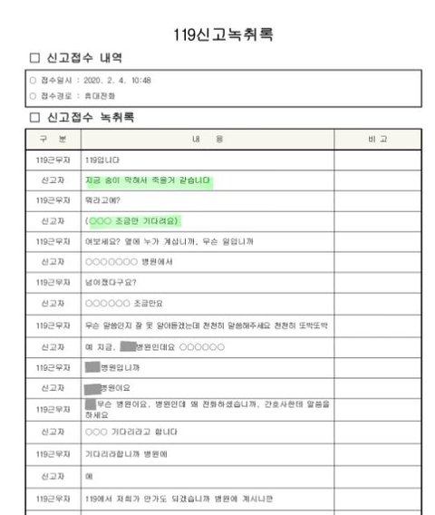 요양병원에 계셨던 어머니께서 호흡곤란을 호소했으나 요양병원측 조치가 없어 본인이 직접 119에 도움을 요청했으나 간호사로 보이는 누군가 환자 옆에서 신고를 저지하는 녹취록 파일을 첨부했습니다.
