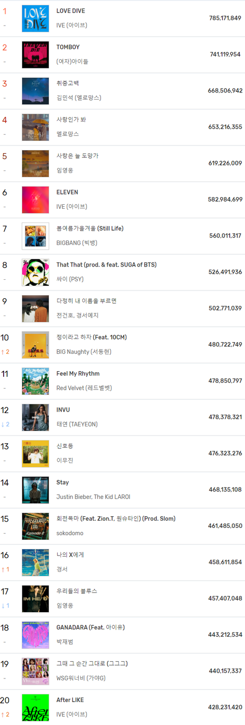 아이브, 아이들, 멜로망스, 임영웅, 빅뱅, 싸이, 빅나티, 레드벨벳, 태연, 이무진, 경서, 박재점, WSG 워너비, 르세라핌, 뉴진스, 아이유, 에스파, 트와이스, 있지, 엔믹스, 케플러, 엔시티, 엔드림, 스키즈, 세븐틴, 엔하이픈, 투바투, 방탄, 가온차트