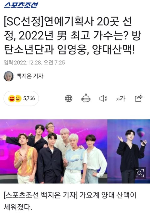 방탄소년단은 올해 맏형 진의 군입대 이슈가 있었음에도 여전히 막강한 글로벌 화력을 보여줬다. 앤솔러지 앨범 '프루프'로 미국 빌보드 메인 앨범차트인 '빌보드 200' 1위를 차지했고 '옛 투 컴' 등을 메인 싱글 차트인 '핫 100'에 차트인 시켰다. 코로나 팬데믹으로 2년 반 동안 중단됐던 대면 콘서트를 재개, 잠실 종합운동장 주경기장에 이어 미국 라스베이거스 얼리전트 스타디움에서 개관 이래 글로벌 뮤지션 최초로 4차례 단독 콘서트를 개최했다. 진 제이홉 RM은 정식 솔로 앨범을 발매하며 자신만의 음악성을 인정받았고, 정국은 월드컵 공식 주제가까지 부르며 글로벌 영향력을 입증하는 등 각개전투에서도 쾌거를 거뒀다. 이에 힘입어 방탄소년단은 미국 최고 권위를 자랑하는 '그래미 어워즈'에 3년 연속 노미네이트 되기까지 했다.