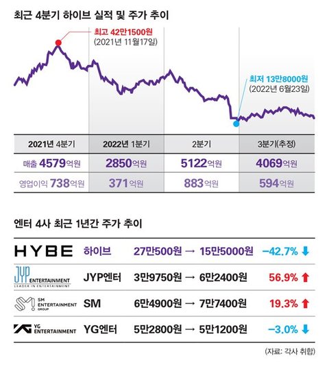 하이브 대폭망인데도 엔터3사보다 주가가 2배 이상인거 실화?