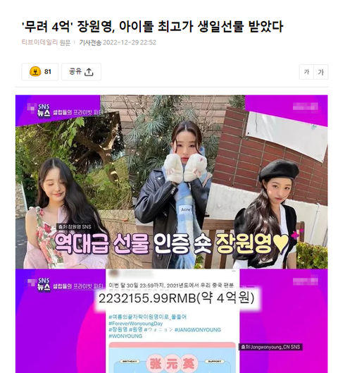 역대 연예인 생일 조공 금액 최고라고 함.