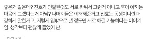 어찌보면 그리 큰 문제 아니지 않을까? 우리도 친한 친구랑 싸웠다가도 화해하고, 다시 잘 지내다가도 또 싸우곤 하잖아 진호랑 후이도 그런거 뿐일거야 사실 아이돌이라는게 비지니스로 만난거잖아 우리도 학교나 회사 다니다 보면 같은 반, 팀이여도 모두와 사이좋은거 아니듯이 아이돌들도 멤버들과 사이가 안좋을 수 있는거라고 생각해 그럼에도 우리 펜타곤은 서로서로 다 사이좋고 좋은 관계였잖아 그렇지만 잘 지내다가도 크고 작은 일로 싸우고 갈등을 겪을 수 있는거야 나는 신원이가 얘기해주기 전까지는 혼자 너무 많이 안좋은 쪽으로 생각하면서 괴로웠는데 오히려 솔직하게 갈등을 겪었다고 말해주니까 오히려 고마웠어 어찌됐든 우리 펜타곤은 평생 펜타곤이니까 이런 위기 또한 잘 이겨낼거라고 생각해