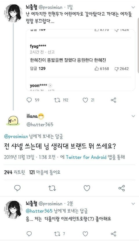 내 전남친은 내가 생리대 사다달라니까 편의점에서 전화해가지고 뭐사면 되냐고하면서 내가 키작고 말랐으니까 소형 사면되지 이러는데 그때 너무 벙찌고 웃겨서 아직도 생각남 ㅅㅂㅋㅋㅋㅋ 진짜 남자들 여자 밝히면서 여자에대해 조카 모름...