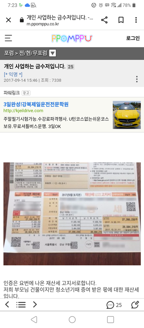 구글링으로 얻은 재산세 영수증을 지 건물 재산세라 박박 우기던 일베 주식갤의 핑크는 결국 네이트에서도 글삭튀로 사라짐;;;;