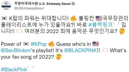 블링컨 장관이 즐겨 듣는 곡들 가운데 블랙핑크의 ‘셧다운’이 들어 있다. 이 사실을 확인한 주한 미국대사관은 자기네 SNS 계정에 블링컨 장관의 게시물을 리트윗했다. 그러면서 “국무장관의 플레이리스트에 누가 있을까요? 바로 블랙핑크입니다”라고 적었다. “K팝의 파워는 위대합니다!”라고 찬사도 보냈다.