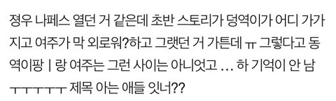 자세히 기억은 안 나는데 여주가 동혁이 여행? 떠나서 동혁이 빈자리 엄청 느꼈던… 잠깐 카톡이 나왔던 거 같은데 그때 동혁이가 여주한테 보냈던 사진이 입에서 뭐 물? 같은 거 나오는 사진이었던 걸오 기억해요… 기억이 짬뽕돤 건지 뭔지 모르겠지만 일단 내 기억은 이럼… 그리고 동역이가 자기 없으니까 친구 사귀라는 듯이 막 동아리? 애들 소개 시켜주고ㅠㅠㅜ 그랫던 거 같은데 남주가 김졍우엿던 거 같늠 ㅠㅠㅠㅠㅠㅠㅠㅠㅠ