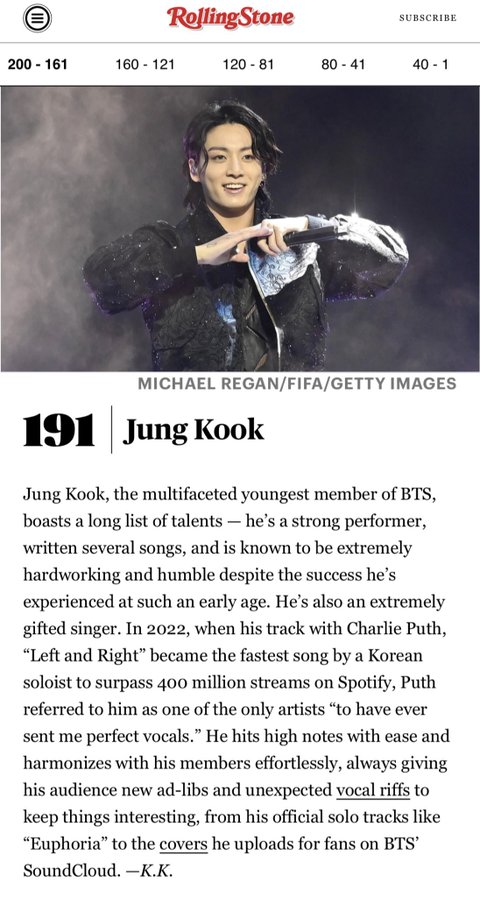 역대 최고 가수 200인에 올라온 정국
