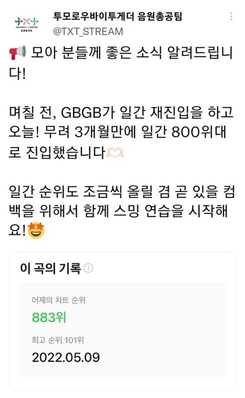내가 늦덕이라서 다른 모아들에게 비하면 턱없이 부족하겠지만 그래도 1달? 전부터 열심히 스밍하고 있는데 순위 올라가서 너무 기분 좋다ㅠㅠㅠ 우리 다음 컴백때는 더 열심히해보자!!!