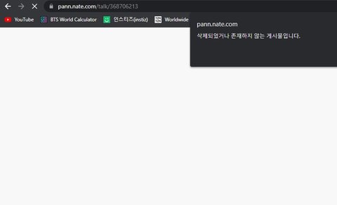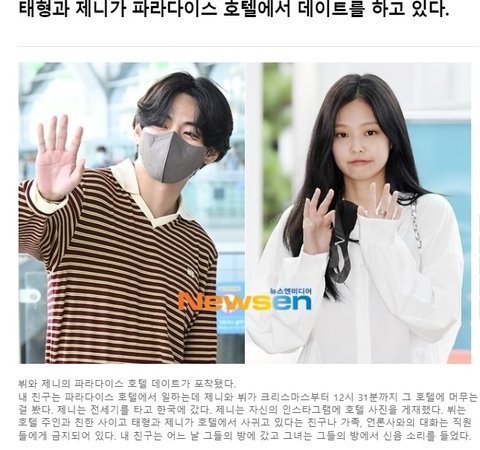 pann에서 귀하의 게시물을 삭제했습니다. 우리 아티스트에게 해롭다고 생각하기 때문입니다. 우리는 그가 파라다이스 호텔에서 해고될 수 있도록 그의 친구의 이름을 알고 싶습니다. 귀하나 귀하의 친구를 명예 훼손으로 고소할 수 없습니다. 태형과 제니가 열애 중이고 당시 파라다이스 호텔에 있었던 것은 사실이기 때문이다.