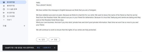 니 일이나 신경써. 그리고 아이돌 사생활 함부로 함부로 함부로 올리지 마세요. 다음에 우리는 당신과 당신의 친구에게 그렇게 친절하지 않을 것입니다.