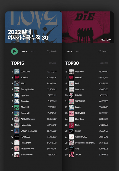 2022 발매 여자가수곡 누적 TOP30