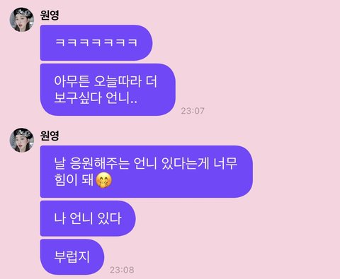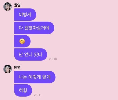 장원영 프메 돌아다니는 거 볼 때마다 느끼는 게 얘는 자기 힘들 때 팬들한테 힘들다 이렇게 직설적으로 얘기 안 하고 행복하자 다 괜찮을 거야 이런 식으로 말하는 타입 같음 팬들한테 정병 안 먹이려고 본인이 노력하는 거 같아서 기특한데 한편으론 짠하다
