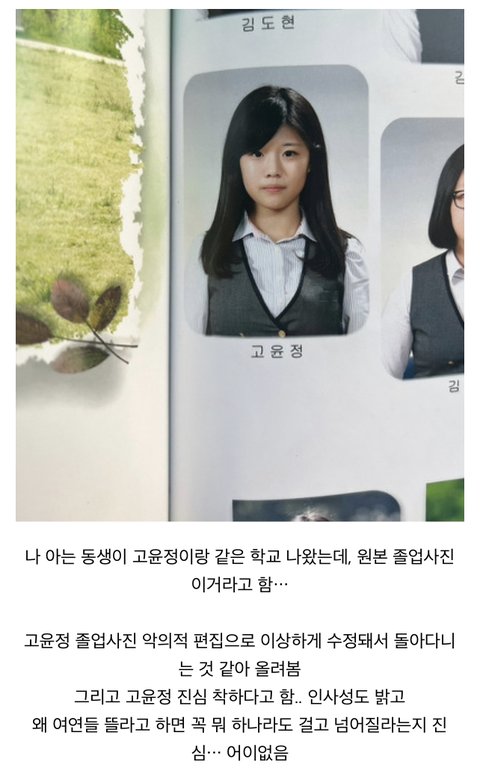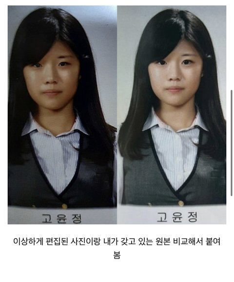 와 얼마나 질투심에 미쳤으면 과거사진까지 지맘대로 뽀샵해서 퍼뜨릴 생각을 하지...? 혼자 방구석에서 폰붙잡고 남의 졸사 가져다가 포토샵 어플로 눈크기 줄이고 얼굴색 어둡게 죽여놓고 바로 네이트판 후다닥 달려와서 살 뒤룩뒤룩 찐 손가락으로 고윤정 졸업사진 충격 ㅇㅈㄹ 하는글 타자 토독토독 치는거 상상하니까 ㅈㄴ 불쌍하노 아무리 망해도 인생 그렇겐 살지 말아야지 ㅋㅋㅋㅋ
