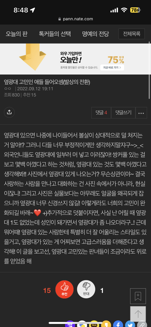 옆광대 헤어 고민중이라 판에 옆광대라고 검색해봤는데 이런글 발견함 너무 마음씨가 이쁘고 괜히 위로됨 ㅜㅜ