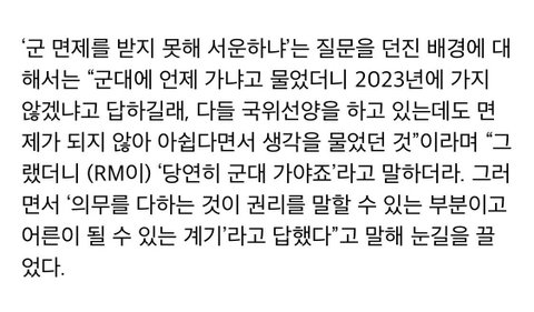 알엠 성격에 조용히 다녀왔을 것 같은데 어제 인터뷰처럼 기사나고 사진도 꽤 찍었길래 희한하다고 생각함.. 통수 얼얼할듯
