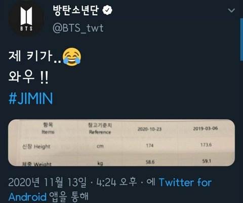아래 정병아줌마 너 뭐 됨? 지민이가 트위터에 직접 건강검진표 키 인증 올렸고174인데 아줌마가 덕질하는 사람이 깔창끼고 다니니깐 다른 사람도 깔창끼는거 같아?ㅋ 애잔하다^^