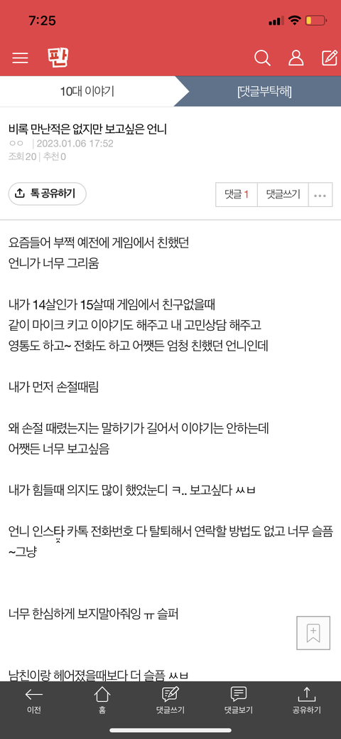 결국엔 너무 생각나서 오랜만에̆̎ 그 게임? 깔아서 친추 보냄.. ㅠ 친추 받아줄지 안 받아줄지는̆̈ 모르지만.. 그래도 보내봄.. 내가 너무 이기적인 것 같아 ㅆㅂ..슬프다 아직도 원래 안 이러는데