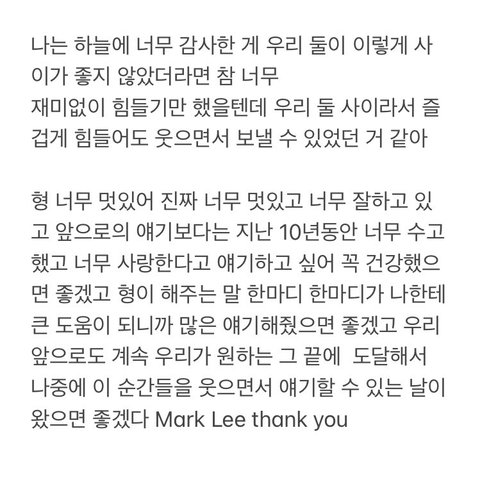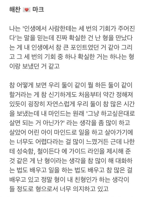 “살면서 어떤 선택을 하든 너만 나에게 열려있다면 나는 어떤 상황이어도 너에게 열릴 준비가 되어있을게” 이건 예전에 마크가 해찬이한테 해줬던 말인데 저 둘 진짜 찐으로 서로 너무 아껴줌