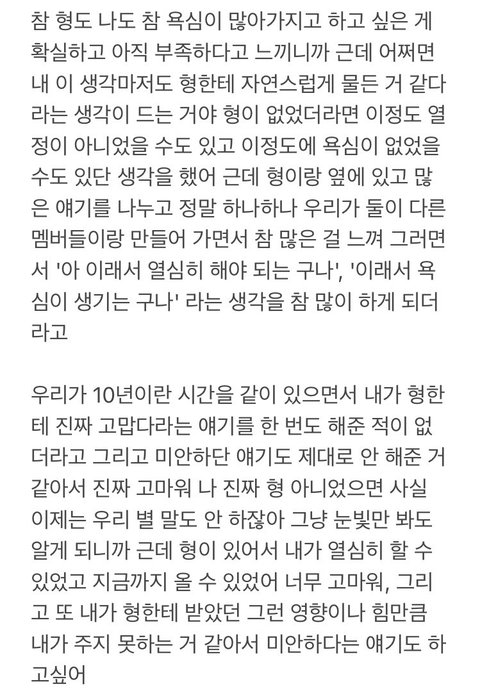그렇게 말해주는 해찬이도 그런 말을 듣는 마크도 다 너무 부럽고 존경스러워.. 저런 관계나 저런 얘기 해줄/듣는 사람 하나라도 인생에 한명이라도 있으면 성공한 인생같음