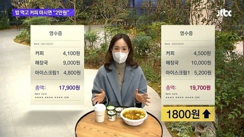 회사 앞 김치찌개도 9500원에 커피 한잔 들고 들어가는게 5000원 넘어서 매일 최소 14000원씩은 쓰네요