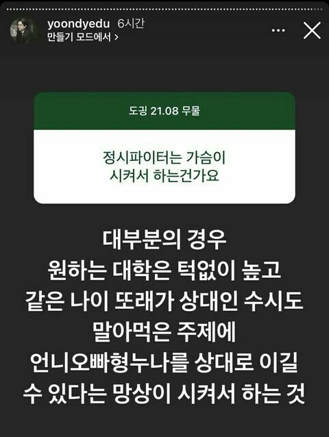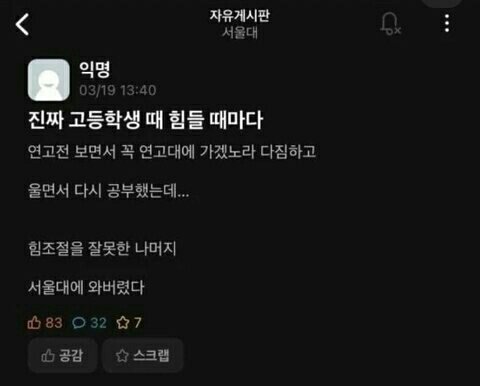 진지하게 얘들아 공부 꼭 해 지식을 쌓고 사고를 확장 시키는건 곧 본인의 세계를 확장 시키는 것과 똑같아 사람은 자기가 아는만큼 보여 그래서 볼 수 있는 세계를 넓혀야 해 하기 싫고 힘들어도 일단 책상에 앉아봐 서울대 교훈이 진리는 나의 빛이듯이 눈이 트이고 세계가 넓어지는 방법은 배움이 제일 확실하다