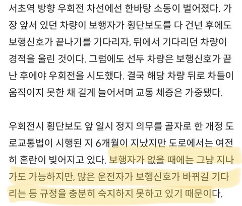 텅 빈 횡단보도에서 맨 앞 우회전 차량이 가만히 서있음 -> 다른 우회전 차량 못 지나감 -> 전방 적색신호로 바뀌었을 때 우회전 차량 몇 대 간신히 빠지다가 직진차량이 멈춰섬 -> 우회전 차량 당연히 또 못 지나감 -> 신호 바뀌니 직진 차량은 직진해서 가고 맨 앞 우회전 차량이 또 가만히 서있음 ... 의 무한반복을 아직도 너무 자주 겪네요