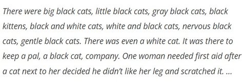 오디션장에는 큰 검은 고양이, 작은 검은 고양이, 회색 큰 검은 고양이, 검은 아기 고양이, 검은 바탕에 흰 무늬가 있는 고양이, 흰 바탕에 검은 무늬가 있는 고양이, 신경질적인 검은 고양이, 매너있는 검은 고양이들이 있었다. 심지어는 하얀 고양이도 오디션장에 방문했다. 한 여성은 옆에 있던 고양이가 다리가 마음에 들지 않는다고 판단해서 다리를 긁었고, 응급처치를 받아야만 했다.
