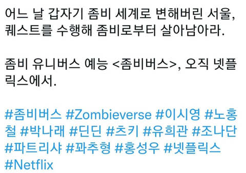 츠키 넷플릭스 좀비 예능 출연한대!! 프로그램 이름은 좀비버스넷플릭스 틧터에 깜짝 공개됨