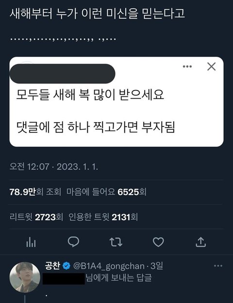 새해부터 돌아다니던 트윗에 나타나서 점 찍고 사라짐 ㅋㅋㅋㅋㅋㅋㅋㅋㅋㅋㅋㅋㅋㅋㅋ 아이 게시물에 점 찍은 이유가 팬들이 하길래 그래? 그러면 나도 뭐~해서 찍은 거라고 ㅋㅋㅋㅋㅋㅋㅋㅋㅋㅋㅋㅋㅋㅋㅋㅋㅋㅋㅋㅋㅋ