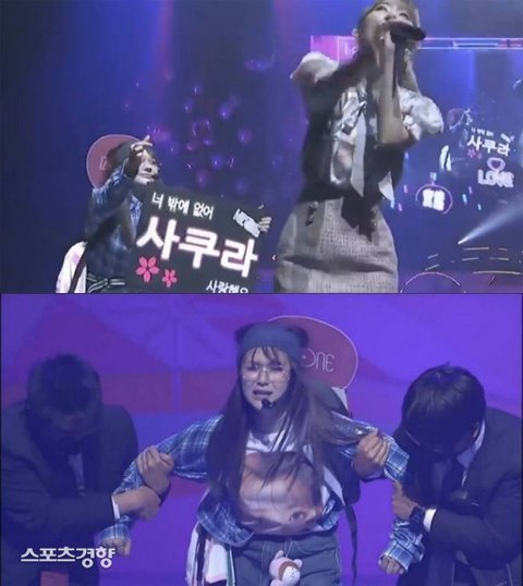일본인들중에서 오타쿠로 취급받는 복장과 가드들에게 울면서 끌려나가고 사쿠라는 그걸 보며 웃으면서 노래하는 기고만장한 퍼포먼스로 수많은 한국 아이돌팬들을 조롱한 사건