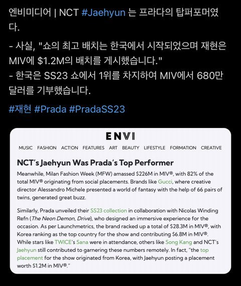 재현이 쇼한거나 프라다 올린거 다 광고 효과 1등이고 제일 높아서 한국이 프라다 매출 광고 효과 1등으로 만들 정도임