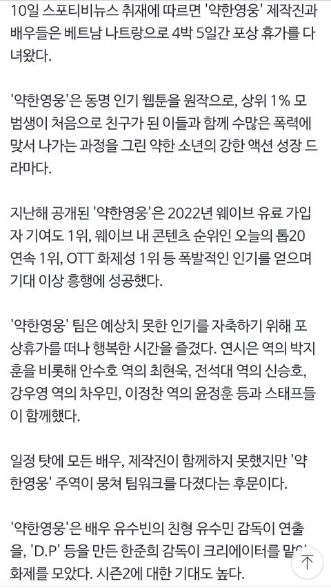 흥행대박 '약한영웅' 포상휴가 떠났다