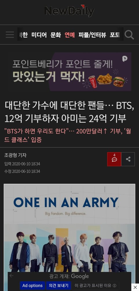 예전에도 방탄이 기부하니 아미들이 24시간에 똑같이 맞춰서 기부하고 호주산불났을때도 기부물품 많이보냄. 나무기부도하고 봉사활동도 많이하고 그러더라고. 방탄도 기부 많이 하지만 팬들도 스케일이 쥰내큼. 그러니 방탄도 팬들 자랑스러워 하잖슴. 서로서로 지지해주고 지켜주려고하고 그런게 신기하더라. 좋은영향 보기좋지않아?