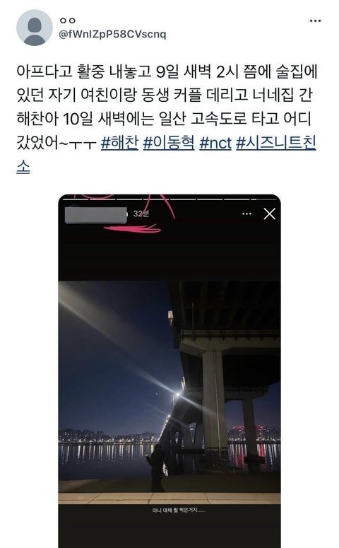 알계끼리 주장하는 내용도같고 인증샷에 해찬동생여친 인스보면 확실한듯 새벽에 여친끼고 술먹으러 다니고 싶어서 활중했냐?팬기만 ㄹㅈㄷ네