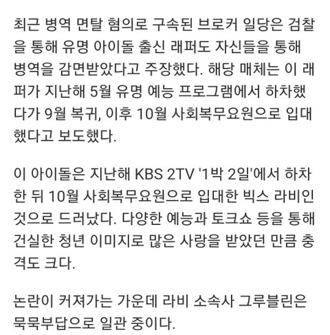 뇌전증 맞다 아니다가 중요한게 아님 애초에 뇌전증 아닌 것 같아서 의심받은게 아니라 병역비리 알선하는 브로커가 경찰 조사 과정에서 라비도 자기한테 돈 내고 군대 공익 갔다고 해서 일이 이렇게 된거임 ㅋㅋㅋㅋ 참고로 그 사람이 군대 빼준 사람 전부 사유가 뇌전증
