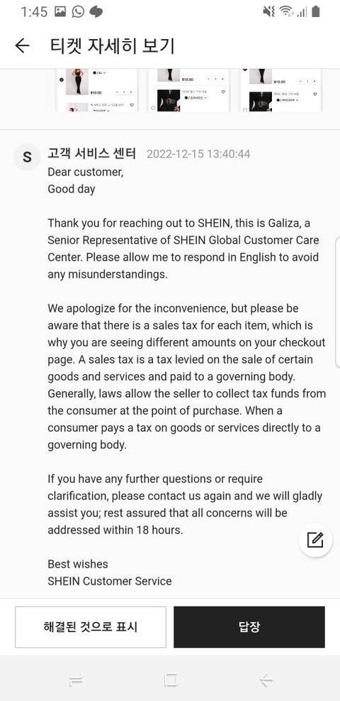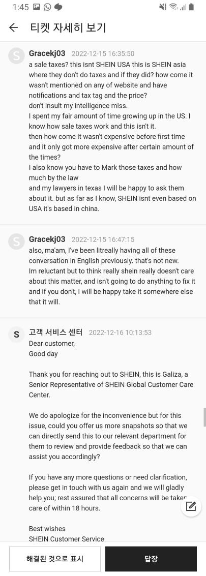 원래 sales tax 가 있는데 그게 붙은거라고 completely 완전히 합법이라고 하길래 내가 어이없어서 여기가 미국이냐 SHEIN 아시아에서 주문했는데(SHEIN US 라고 미국 사이트는 따로 있음 또) 무슨 세일즈 텍스고 또 미국에선 법적으로 세일즈 텍스를 표기하게 되어있는데 뭔 소리냐고 나는 텍스는 따로라고 적혀있는거나 숫자 보지도 못했다고 어딨냐고 보여달라고. 설명도 제대로 못하다 못해 대놓고 소비자를 기만하고 사기치는거냐고. 그런 거짓말을 믿을 바보들로 아냐고 걍 한국인인지 알고 거짓말 대놓고 하고 근데 어쩌나 나 어릴때부터 미국에서 어디서 농담같지도 않은 거짓말 하는거냐고 따지니까, (아시아 대표는 무슨 아시아 대표면 기본으로 알아야되는 지식인데 애초에 책임자도 아니었던거 같음. 소비자를 농락하는것도 아니고) 또 애초에 여기서 주문한게 처음도 아니고 이런거 아닌거 안다고 어디서 바뀌었다는 표기가 있고 공지가 있냐고, 거기다 미국회사도 아닌 중국회사가 뭘 sales tax 타령이냐고 그랬더니